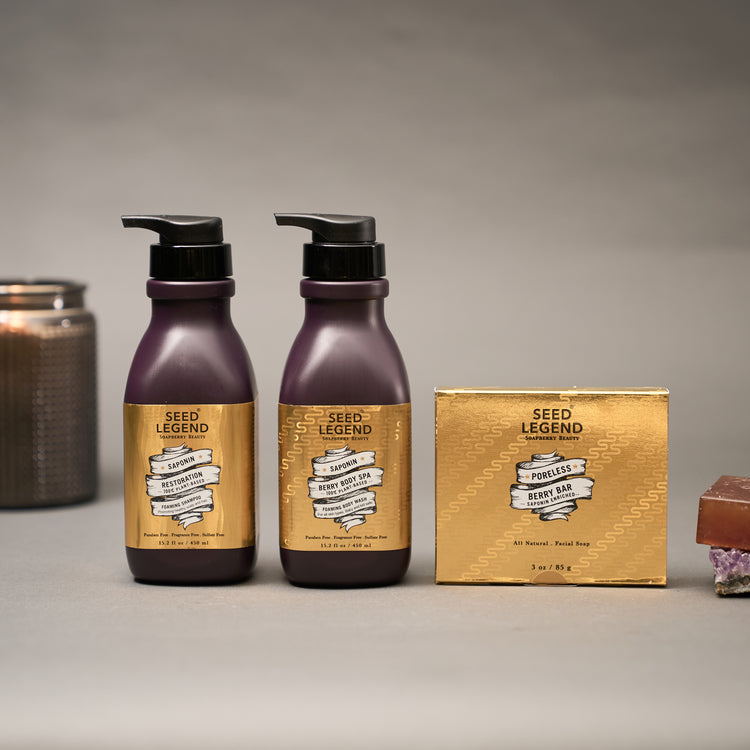 The short answer: the finest ingredients and time. Every Seed Legend product is packed full of precious saponin which is extracted from soapberries. In fact, in order to obtain the amount of saponin that goes into each 1L bottle of Seed Legend Restoration Foaming Shampoo, 3 lbs. of soapberries are required!